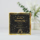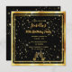 Um cartão de convite de aniversário moderno e moderno para uma mulher. Um fundo preto clássico, com falso quadro de ouro e flautas, vidro e bolhas, letras ouros coloridas. Modelos para informações sobre a sua parte. Traseira: preto e bolhas