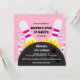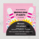Convite de aniversário para meninas com bola de boliche derrubando pinos de boliche. Fundo rosa. Texto de convite personalizável. Para obter solicitações personalizadas ou ajuda para personalizar, use o link de contato de armazenamento acima.