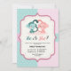 Gênero revela convite de festas sobre um fundo azul-lacrimejante e bolinhas rosa com ilustração de macaco-menino e menina