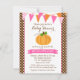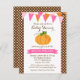 Um convite para chá de fraldas do tema do outono com uma abóbora e um design de banner de caneta. Este convite para chás de fraldas bonitinho de outono é cor de laranja, rosa e marrom. Personalize facilmente uma festa de chá de fraldas de menina.