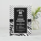 Um convite de aniversário 60º preto e branco com bolinhas e faixas de zebra.