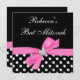 Um convite de morcego feminino mitzvah com um coração de diamante falso e uma ilustração de arco de fita rosa, acentuando um padrão de bolinhas preto e branco. Designs são ilustrações/gráficos impressos - NÃO EMBELÉCIES REAIS