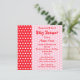 Um design de chá de fraldas personalizado para se o bebê vai ser uma menina. Um padrão de bolinhas em vermelho e branco, com um padrão de bolinhas branco e rosa claro atrás do escrevendo. O texto está em vermelho e pode ser personalizado para criar um design personalizado. Uma design de menina divertida.