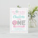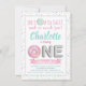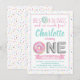 Convites de festa de 1º aniversário de menina com donuts de sprinkle em aquarela e letras de balão de folha prateada em um fundo de sprinkles pastel. Este convite de primeiro aniversário de donut adorável é facilmente personalizado com seus detalhes.
