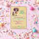Traga diversão e risos para sua comemoração de aniversário com este convite divino e humorístico! Apresentando uma reluzente aniversariante, com cabelos selvagens do tipo arco-íris e olhos castanhos extragranhos, ela mostra orgulhosamente sua obra-prima — um bolo de aniversário com velas brilhantes — para aprovação. Vestida com um vestido de bolinhas vibrante e sobredimensionado e meias multicoloridas em suas longas pernas de pau, ela adiciona um toque divertido e alegre ao seu evento especial. Personalize este cartão encantador com os detalhes do seu próprio partido e impressione os seus convidados com um convite único e colorido!