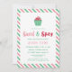Convite açucarado para um chá de panela com tema doce e apimentado com listras diagonais rosa e verde, fontes fofas e um bolo de pimenta adornado com glacê rosa.