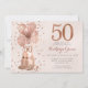 Este belo convite de aniversário 50º com um bolo de ouro de 2 camadas com balões de ouro de rosa com rosa, o número 50 em ouro de rosa e um confete de ouro de rosa brilhante em blush seria perfeito para celebrar sua esposa, mãe, irmã, amiga, colega de trabalho. É tradicional e clássico enquanto é fresco, moderno e contemporâneo. As costas são uma adorável folha de ouro rosa coordenadora.