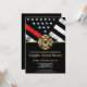 Este design apresenta uma bandeira de bombeiros com listras pretas e brancas, e uma fina faixa vermelha também. Um crachá de bombeiro está sentado acima de todos os detalhes da festa para o bombeiro graduado. Esta design também trabalha excelente para um bombeiro aposentado, tenente, ou festa de aposentadoria do chefe.