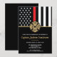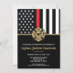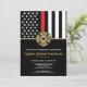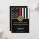 Este design apresenta uma bandeira de bombeiros com listras pretas e brancas, e uma fina faixa vermelha também. Um crachá de bombeiro fica acima de todos os detalhes da festa para o bombeiro aposentado, tenente ou festa de aposentadoria do chefe.