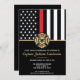 Este design apresenta uma bandeira de bombeiros com listras pretas e brancas, e uma fina faixa vermelha também. Um crachá de bombeiro fica acima de todos os detalhes da festa para o bombeiro aposentado, tenente ou festa de aposentadoria do chefe.