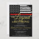 Este design apresenta uma bandeira de bombeiros com faixas pretas e brancas, e uma fina faixa vermelha de linha também. O texto "A lenda está se aposentando" fica acima de todos os detalhes do partido para o bombeiro aposentado, tenente ou chefe.