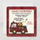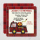 Festa de aniversário do motor de incêndio com padrão de xadrez adorável com fotografia. Personalize o texto e a foto conforme preferido.