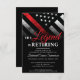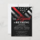 Este design apresenta uma bandeira de bombeiros com faixas pretas e brancas, e uma fina faixa vermelha de linha também. O texto "A lenda está se aposentando" fica acima de todos os detalhes do partido para o bombeiro aposentado, tenente ou chefe.
