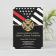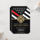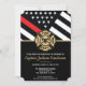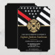 Este design apresenta uma bandeira de bombeiros com listras pretas e brancas, e uma fina faixa vermelha também. "Parabéns" e o crachá de bombeiros se senta acima de todos os detalhes da festa para o bombeiro aposentado, tenente ou festa de aposentadoria do chefe. Os convites também podem ser personalizados para um formando da academia de bombeiros.