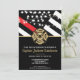 Este convite para a aposentadoria de bombeiros tem uma bandeira de bombeiros com listras pretas e brancas, e uma fina faixa vermelha também. Um crachá de bombeiro fica acima de todos os detalhes da festa para o bombeiro aposentado, tenente ou festa de aposentadoria do chefe. Os convites também podem ser personalizados para um formando da academia de bombeiros.