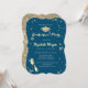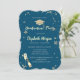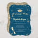 Dourado boné de formatura brilhante, vidro de champanhe e estrelas sobre fundo azul.