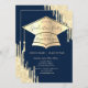 boné de formatura Dourado, diamante e brilho dourado pingam em um fundo azul marinho.
