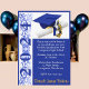5" por 7", tema "Convite para graduação, Boné e Diploma, com "Ano" trabalho de arte, em azul real, Dourado e branco, com fundo azul real. O verso do convite inclui o nome do formando, Pode ser personalizado com as suas próprias imagens, trabalho de arte, etc.