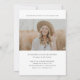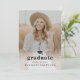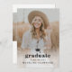 Um convite elegante de graduação com uma grande foto vertical com boné de formatura e texto editável mínimo na frente. A parte de trás tem uma foto horizontal e um local para anunciar o formando e os detalhes da festa.