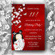 Uma boneca de kokeshi em um Kimono vermelho branco sob uma árvore branca de cherryblossom. Com um fundo vermelho brilhante. Com um texto personalizado em uma fonte elegante para as festas de aniversário femininas.