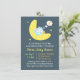 Um coelhinho bebê fofo está aproveitando sua soneca na lua com um pacificador azul em sua boca enquanto pensa em cenouras. Pequenas estrelas brilham ao redor do coelho. Este convite é bonito e alegre para estabelecer o clima para a chá de fraldas ser mamãe! Um padrão de lua e estrela para a página inversa. Personalize facilmente com os detalhes do seu partido. A cor de fundo azul escura pode ser alterada.