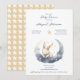 Na moda e fofo, quem não ama coelhinhos? Este design é perfeito para o chá de fraldas que vai ser a futura mãe. Ele apresenta um belo coelhinho em uma lua nublada com estrelas amarelas. A parte traseira apresenta uma cor correspondente e um padrão de estrela. TODO o texto é personalizável para ajustado das necessidades de planejamento de seu partido. Parabéns à nova mãe.