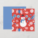 Um boneco de neve fofo com um chapéu vermelho e preto, e um cachecol azul claro. em um fundo vermelho com flocos de neve.