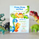 Um convite de aniversário de dinossauros de bebês, bonito e colorido; atraente para as crianças, cores brilhantes, bom para festas de aniversário de idade infantil.