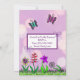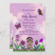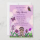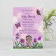 Bonita Mão desenhada, menina roxa, borboletas, flores e arcos, convites para bebê chuveiro. Este bebê étnico pode representar uma menina afro-americana.