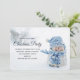 Um convite de festas de Natal uma fotografia fofa e festiva com um pequeno boneco de neve. Lá fora, no inverno, com neve caindo por toda parte. Esta cara bonita está vestida de roupa azul ao ar livre. Algumas botas brancas/cinzas piscam no fundo.