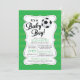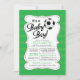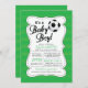 Um convite moderno ao chá de fraldas desportivo ousado e brilhante, com uma bola de futebol fofa. Nossa, é um convite para o futebol de um menino bebê é colocado em uma grama verde sobre o padrão de faixa verde e tem um retorno para um toque especial extra. Perfeito para um chá de fraldas de garotos estrelas