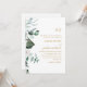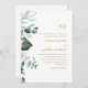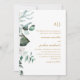 Bonito convite de casamento rústico apresenta floral branco chico e verde com um monograma elegante.