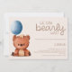 Adorável convite para chá de fraldas de menino com um ursinho castanho segurando um balão azul. O sentimento diz "podemos esperar muito" numa tipografia divertida e divertida. Ilustrada e projetada por Patricia Alvarez.