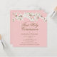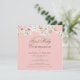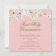 Um elegante convite de primeira comunhão, com uma delicada flor branca, enquadrando seus primeiros detalhes sagrados da comunhão em uma elegante tipografia de ouro, em um bonito fundo rosa. Projetado por Thisnotme©