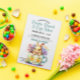 O convite para a sua caçada de ovos na Páscoa e na Páscoa apresenta um coelho marrom giro e giro, sentado num teacup verde-azul pálido pintado com flores amarelas brilhantes. Atrás da cabeça estão flores roxas, rosa e amarelas. Alterar as Informações do convite para as nossas linhas de espaço reservado será um snap. Os detalhes estão em duas fontes contrastantes - principalmente em preto, mas em "Brunch Páscoa", "& Egg Hunt" e "Lembre-se dos seus BASKETS!" em um Ovo Azul de Robin profundo. A cor do topo se repete em uma cor sólida na parte traseira da placa.