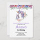 Convite de aniversário com uma elegante ilustração de aquarela com uma mãe de aquarela e um bebê com mané roxo e pedófilo. Flores deliciadas rodeiam o par. Um buquê floral de aquarela ao longo da borda superior.