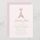 Elegant baby shower invitation featuring a charming Paris Eiffel Tower illustration topped with a delicate pink bow and soft blush tones. Inspired by classic French style, this design blends timeless elegance with sweet, feminine charm.