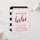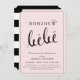 Este convite de chá de fraldas de menina "Bonjour Bebe" minimalista, chique e moderno apresenta um fundo cor-de-rosa com um chapéu de bereto na cinza. O verso apresenta um fundo branco com faixas pretas. Personalize para suas necessidades. Você pode encontrar produtos correspondentes na minha loja.