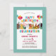 Uma bela coleção de animais de desenho animado coloridos celebrando com balões de aniversário. Crianças Feliz convite de festas de aniversário.