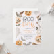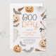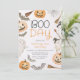Este design apresenta o tema de aniversário do Dia das Bruxas "Boo Day" com abóboras laranja bonitinhas, fantasmas assustadores, teias de aranha, vassouras e morcegos, para um perfeito aniversário de criança de abóbora assustador e neutro em termos de gênero. Personalize-o com os detalhes pessoais do seu partido e torne-o seu.