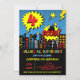 Boys Boom Comic Superherói 4.º Aniversário Convite Colorido como rapazes super-heróis 4.º convite de aniversário com uma paisagem urbana, uma bomba, grande número de anos e vários elementos cômicos.