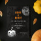 Boos e Booze - Convite à Festa de Halloween para Adultos. A design apresenta abóbora desenhada à mão, lua de cheio e morcegos. Coincidindo com itens da festa do Dia das Bruxas em nossa loja. Personalize com seus detalhes.
