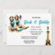 Um par de botas de cowgirl azuis e marrom-reluzente parece brilhar e brilhar sobre um fundo branco que tem uma garrafa de bolha no canto inferior direito e modelos editáveis pretas à esquerda. Este design de conteúdo elegante e genérico é ideal para um chá de panela temático "botas e espumante" do país ocidental.