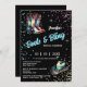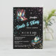 Um design divertido com turquesa, cor-de-rosa e cintilação dourada escura contra um fundo preto sobre o qual aparece um par de cristais cintilantes e botas de couro e um chapéu brilhante. Modelos brancos editáveis aparecem à direita e abaixo da inicialização e as palavras do roteiro de caligrafia "botas e borras" em azul-turquesa são inclinadas levemente para cima, dando um olhar chic e elegante para o design geral. Esse convite para na moda é ideal para um chá de panela temático do país ocidental.