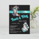 Uma bota de solteiro castanha de couro tem painéis brilhantes iridescentes e penas brancas ao seu redor. Uma banda lacrimogênea é vista atrás dela, descendo sobre um fundo preto e reluzente, cor-de-rosa-xífero e balões prateados descendo no canto inferior direito. Modelos brancos editáveis aparecem à direita e abaixo da inicialização e as palavras do roteiro azul verde caligráfico "botas e borras" são inclinadas levemente para cima, dando um olhar chic e elegante para o design geral. Esse convite para na moda é ideal para um chá de panela temático do país ocidental.
