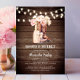 Bonitos convites de chá de panela rústicos personalizados e BUBBLY para aquela garota do sul (Texas segura). Leve-o-rosado, cor-de-rosa-d'água, peonias, flores em cowboy / botas de cowboy e champanhe com óculos de flauta. Painéis de madeira, cor de celeiro castanho com luzes cintilantes. Convites perfeitos para qualquer tema da festa do chá/país ocidental rústico / sul (fazenda); tema de solteira, verão, primavera ou qualquer época do ano. Cartões modelo fáceis de editar; cor, texto, fonte podem ser alterados. Opção digital / download. Veja os itens correspondentes para coordenar toda a sua parte!
