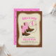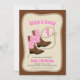O convite de aniversário desta criança apresenta um tema ocidental desenhado especificamente para uma menina. O fundo é marrom com borda de corda e acentua-se com um par de botas cor-de-rosa e um lasso. A parte de trás é um gráfico de bandana rosa.