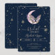 Lua celestial, borboleta e estrelas sobre fundo azul marinho.