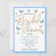 Esta é uma Borboleta Azul e um convite para Chá de panela temático Glitter Dourado. Este convite elegante inclui belas borboletas azuis de diferentes tonalidades e uma letra brilhante. convites de chá de panela brilhante, convites de chá de panela dourados