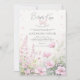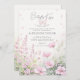 Uma ilustração encantadora de aquarela de um canto do jardim com flores silvestres em delicados tons de rosa, com uma borboleta rosa definindo o título, "Beijos borboletas e desejos de bebês" é o fundo desse convite para chá de menina com um tema de borboleta que combina outro tema de tendência: flores silvestres. A elegante caligrafia moderna coloca um toque extra no título desse convite para chá de menina que é perfeito para uma celebração de primavera ou verão.
